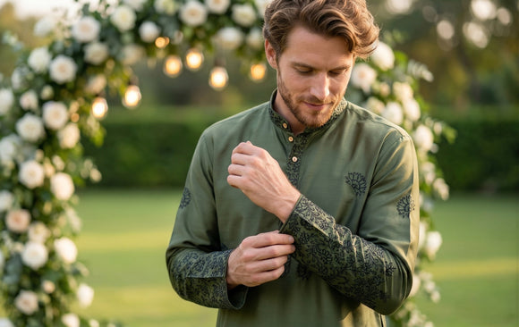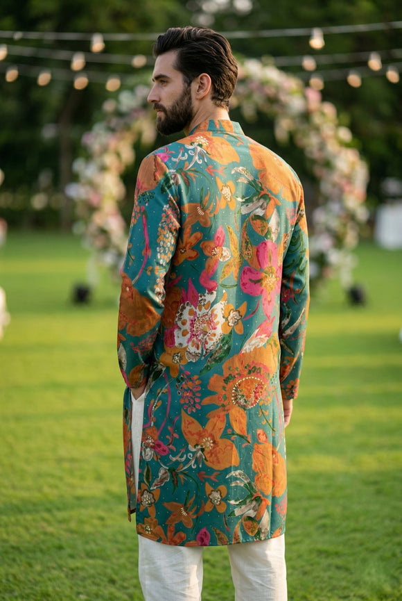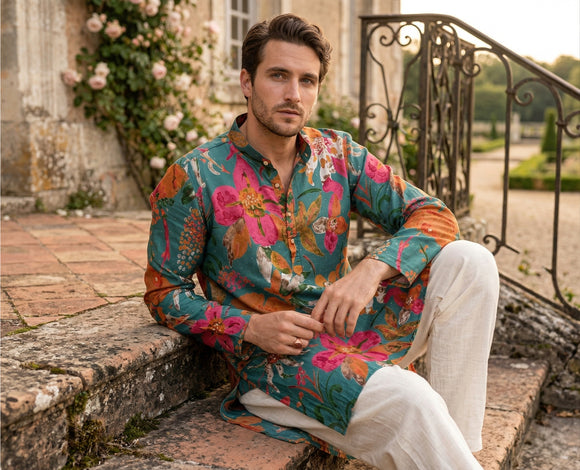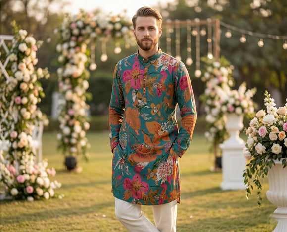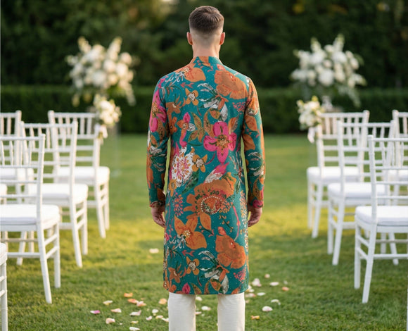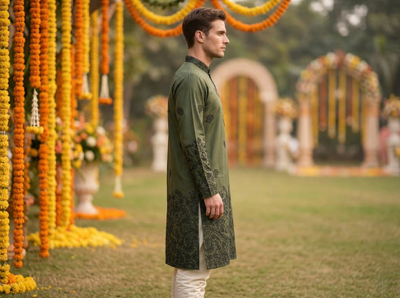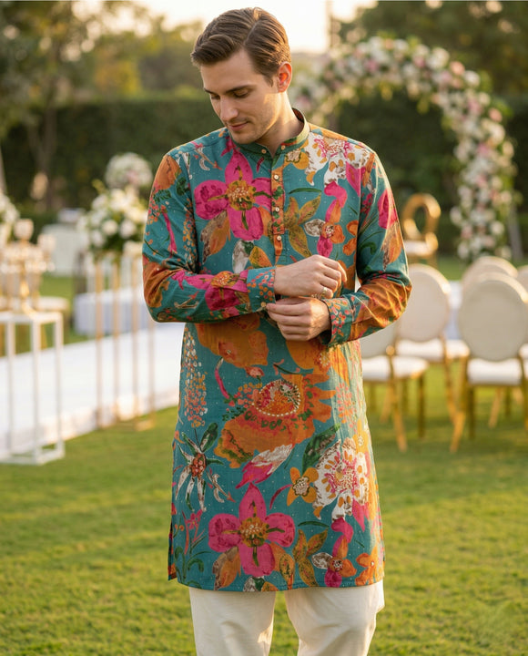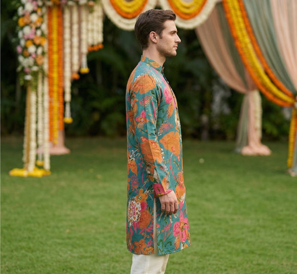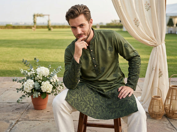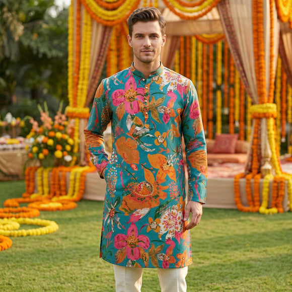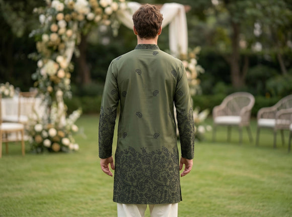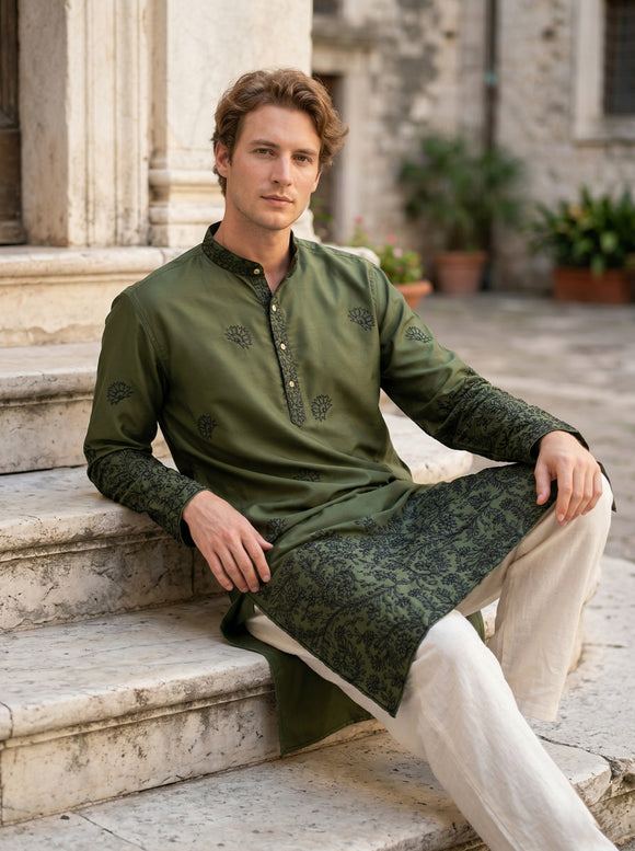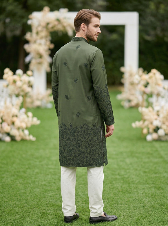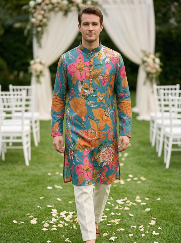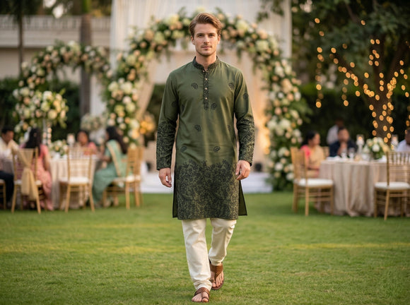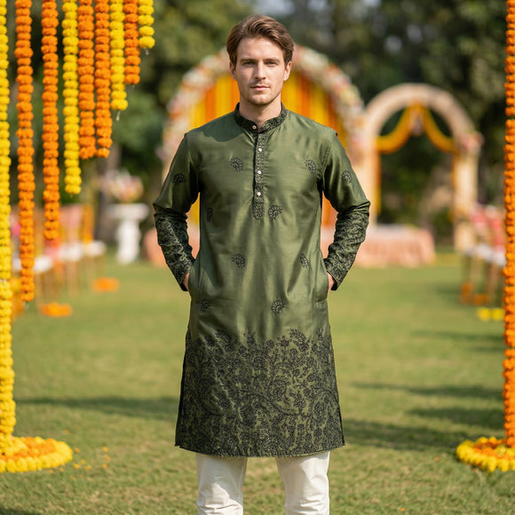 Men Cream Peacock Embroidered Ethnic Kurta with Floral Border