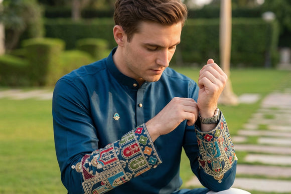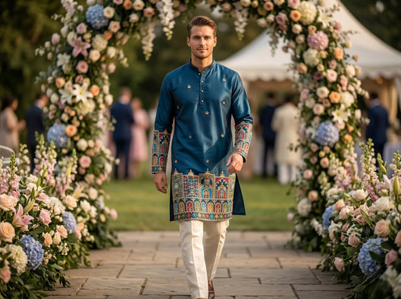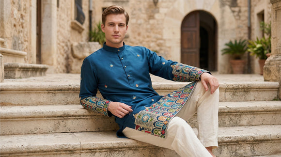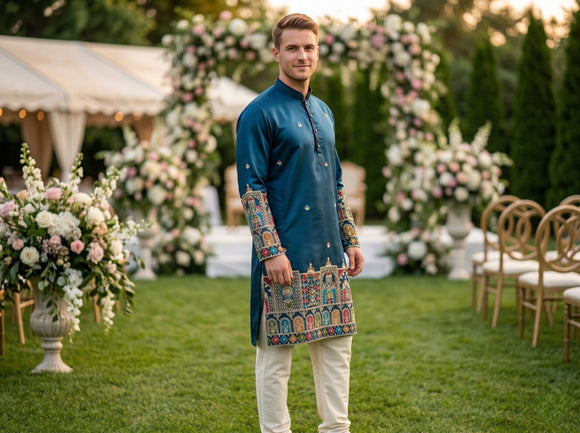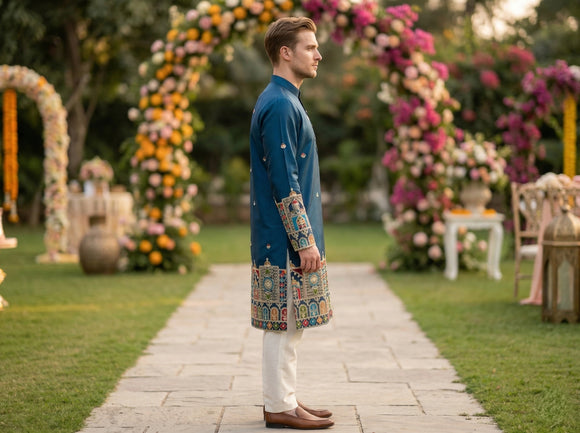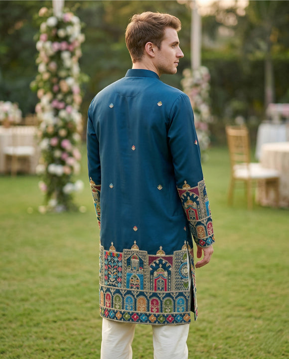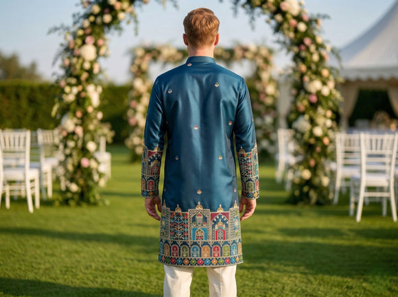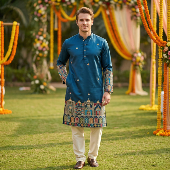 Men Blue Kurta for Festive & Wedding Wear with Ethnic Border