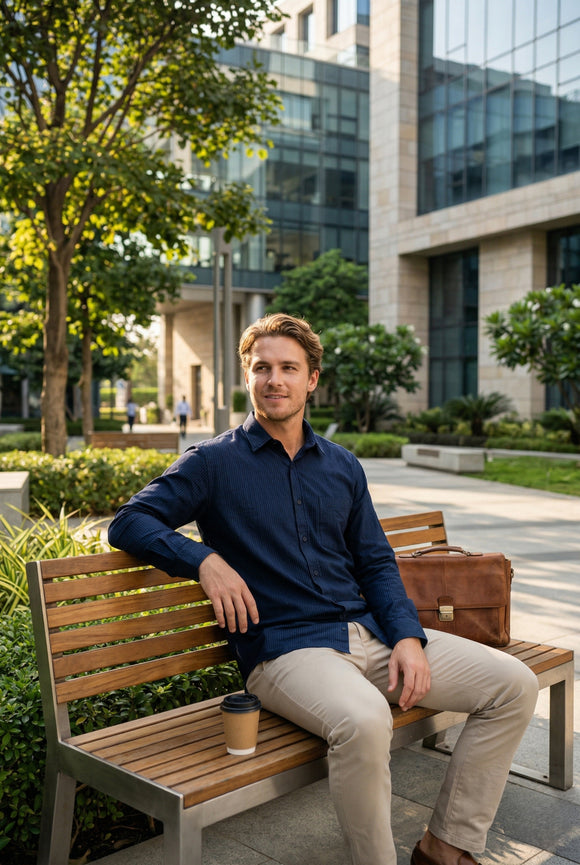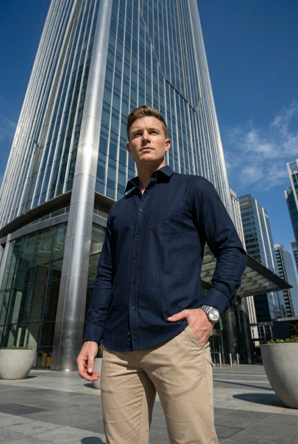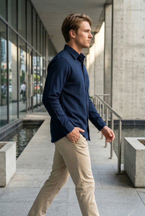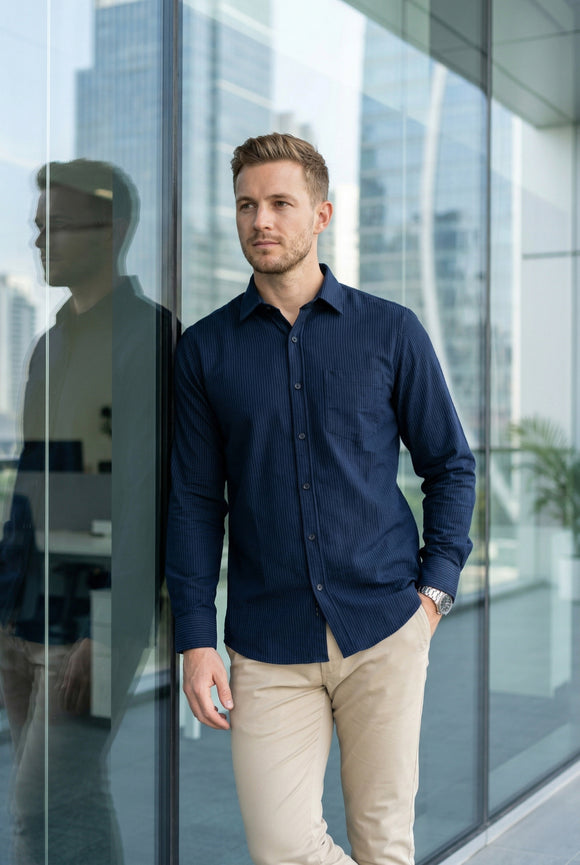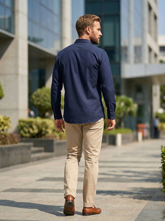 Men Navy Blue Textured Striped Slim Fit Casual Shirt