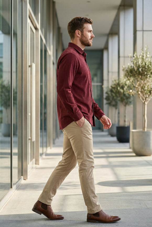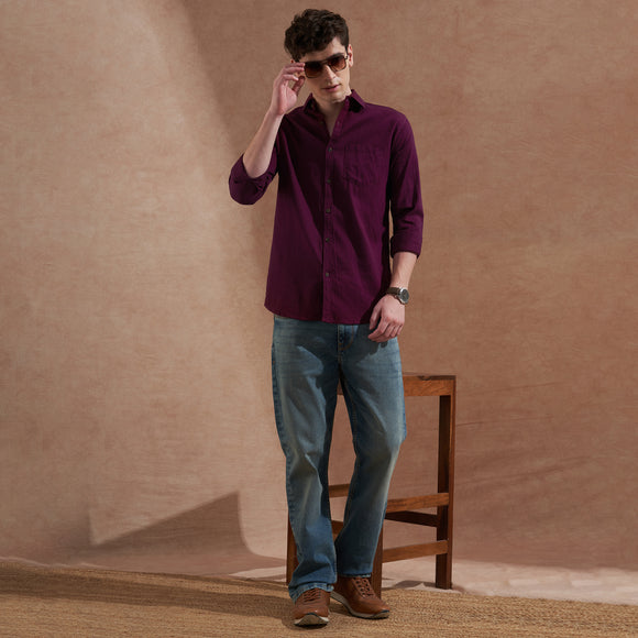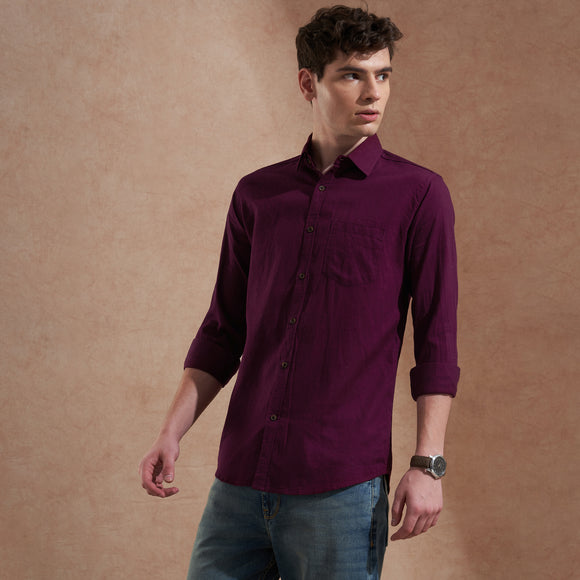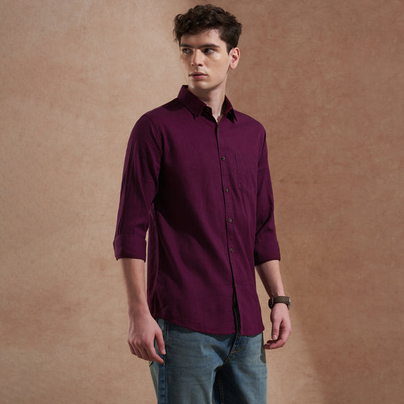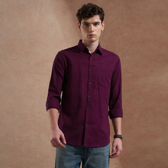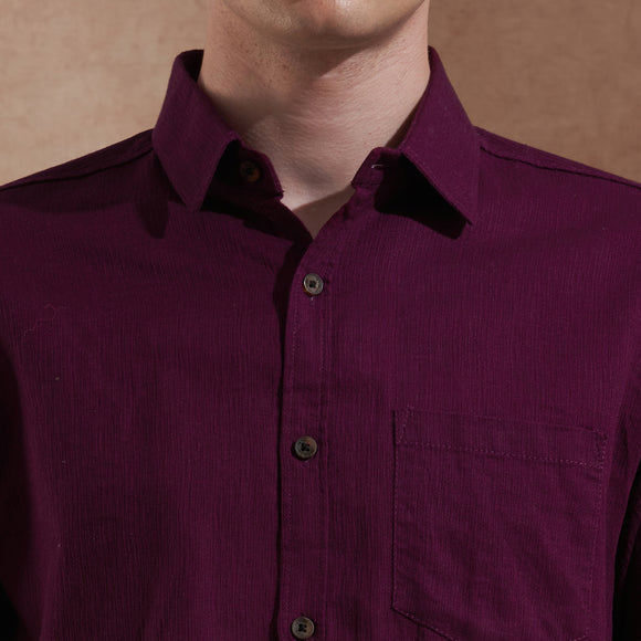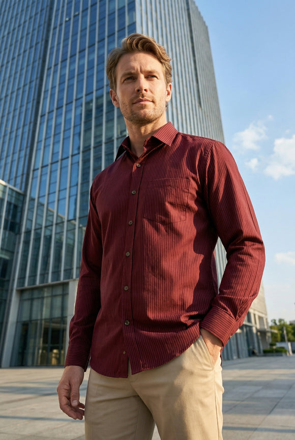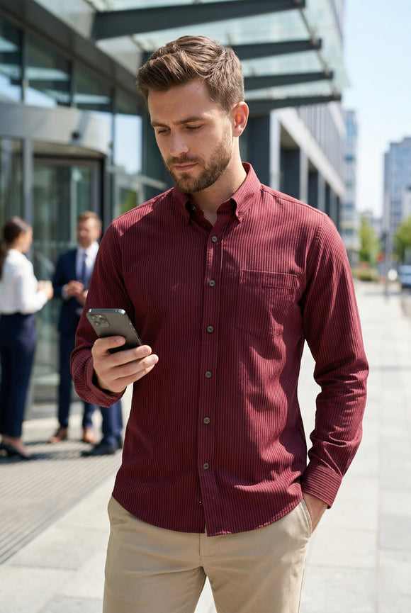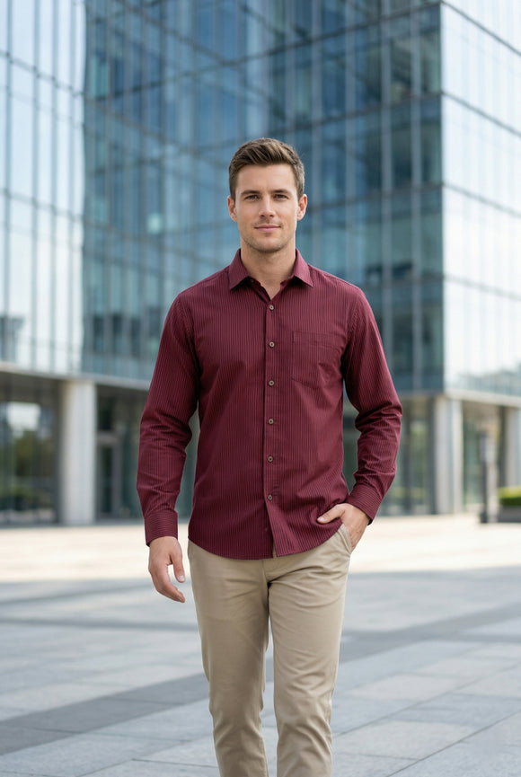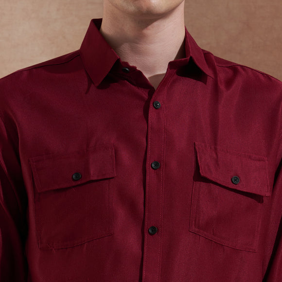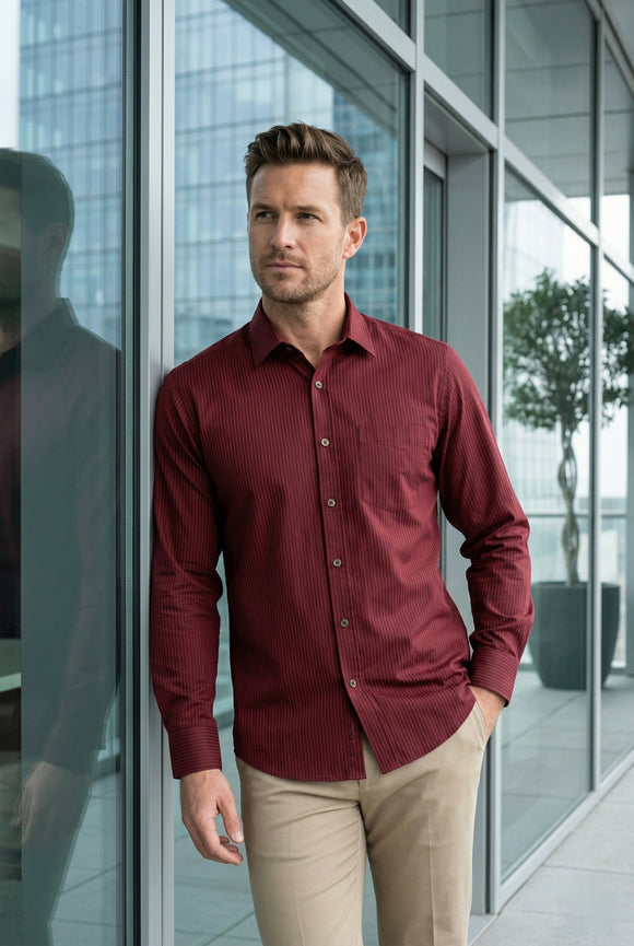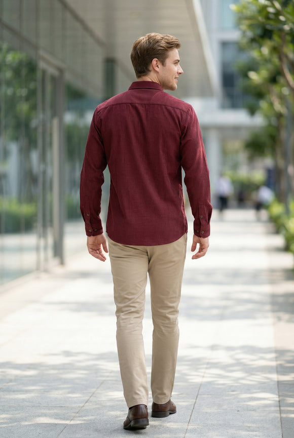 Men Burgundy Textured Striped Slim Fit Casual Shirt