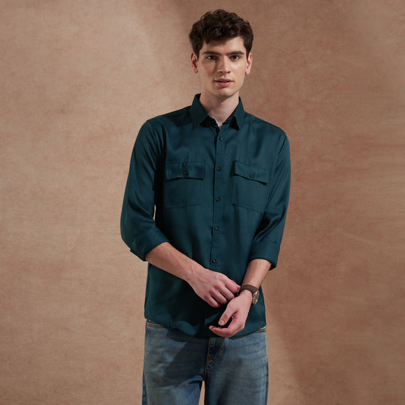 Men Dark Green Solid Spread Collar Slim Fit Casual Shirt