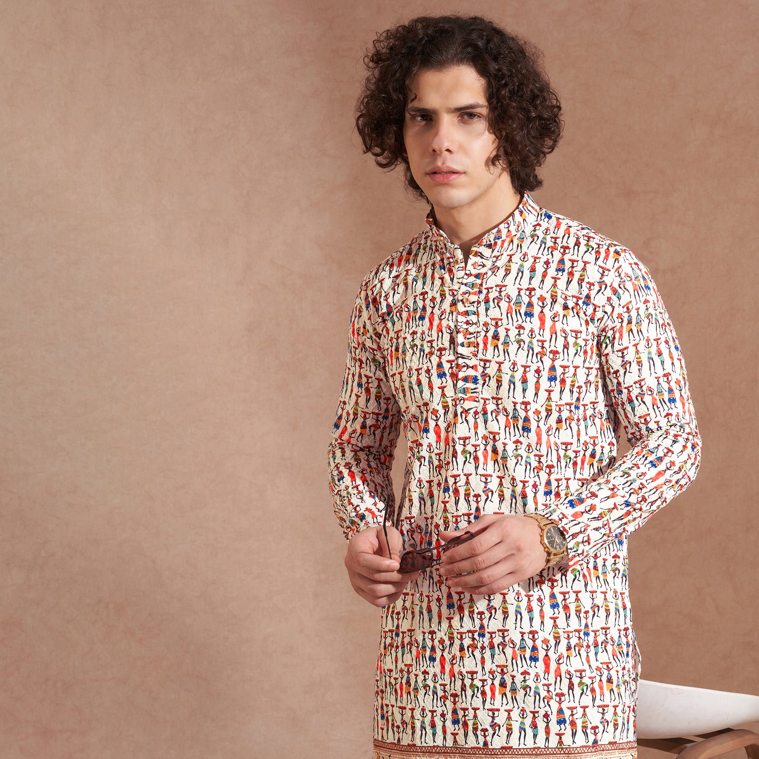 Men’s Cream Chikankari Kurta with Artistic Harvest-Inspired Print