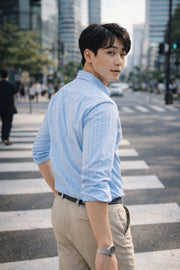 Crafted from a soft and breathable cotton-blend fabric, it feels lightweight on the skin and keeps you comfortable through long hours. The subtle vertical stripe pattern on a crisp Light Blue base adds a refined and elongating effect, making it a versatile choice for both casual and smart-casual occasions.