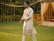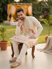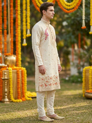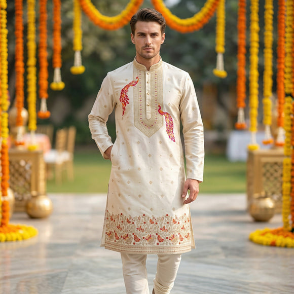 Men Cream Peacock Embroidered Ethnic Kurta with Floral Border