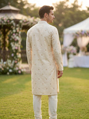 The finely detailed embroidered placket and collar enhance its regal appeal, while the intricate floral border along the hem adds richness and depth to the overall design. Subtle all-over motifs maintain a clean and premium aesthetic, making it perfect for sophisticated occasions.