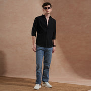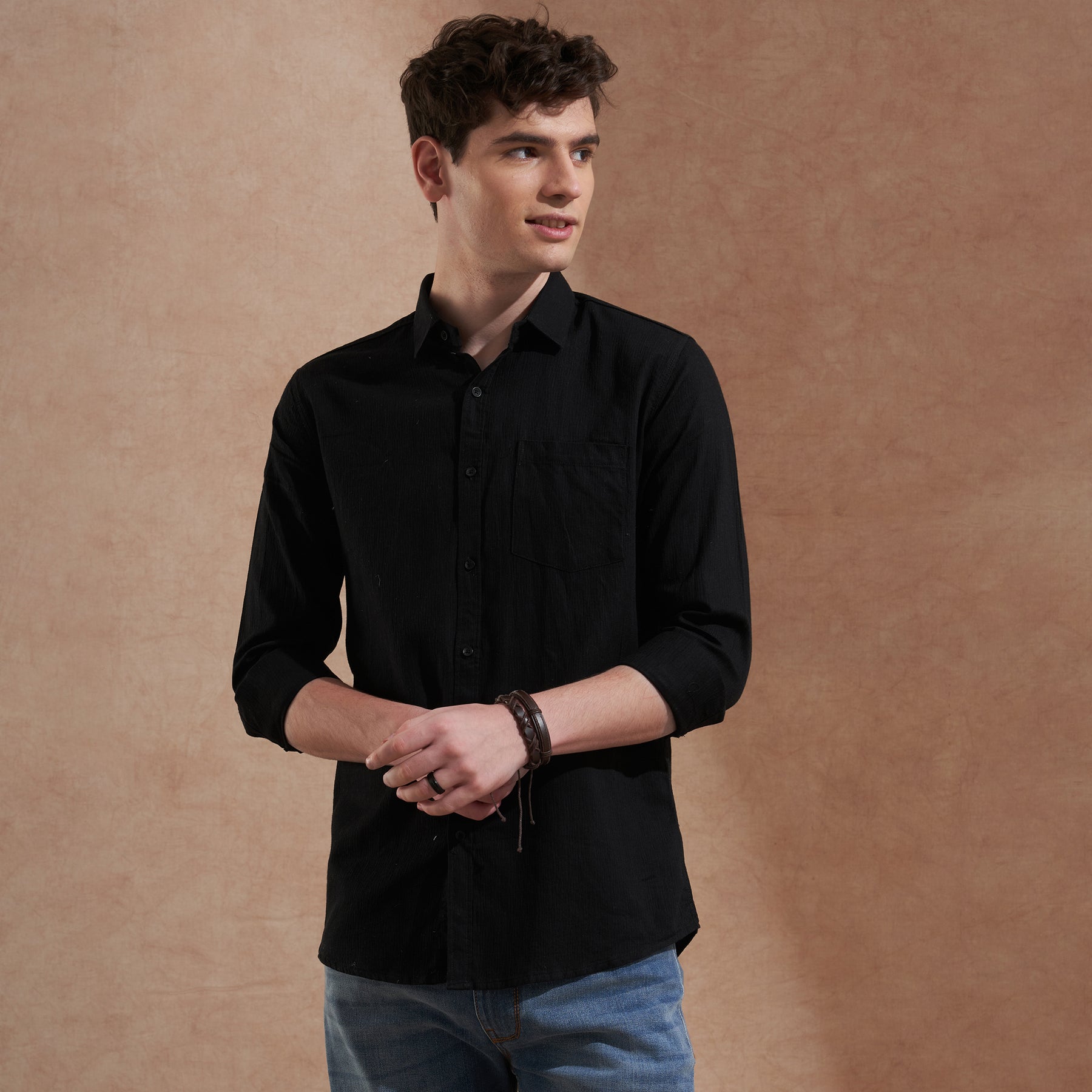 A: This is a men’s solid Black casual shirt with a slim-fit silhouette and a spread collar, designed for versatile everyday wear.