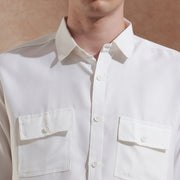 A: This is a men’s white solid casual shirt with a slim-fit silhouette and dual flap pockets for a modern utility style.
