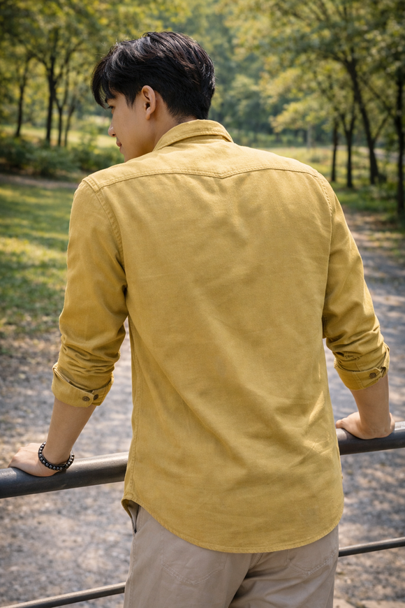A: This shirt comes in a Mustard Yellow shade, offering a clean, fresh, and versatile look suitable for both casual and smart-casual wear.
